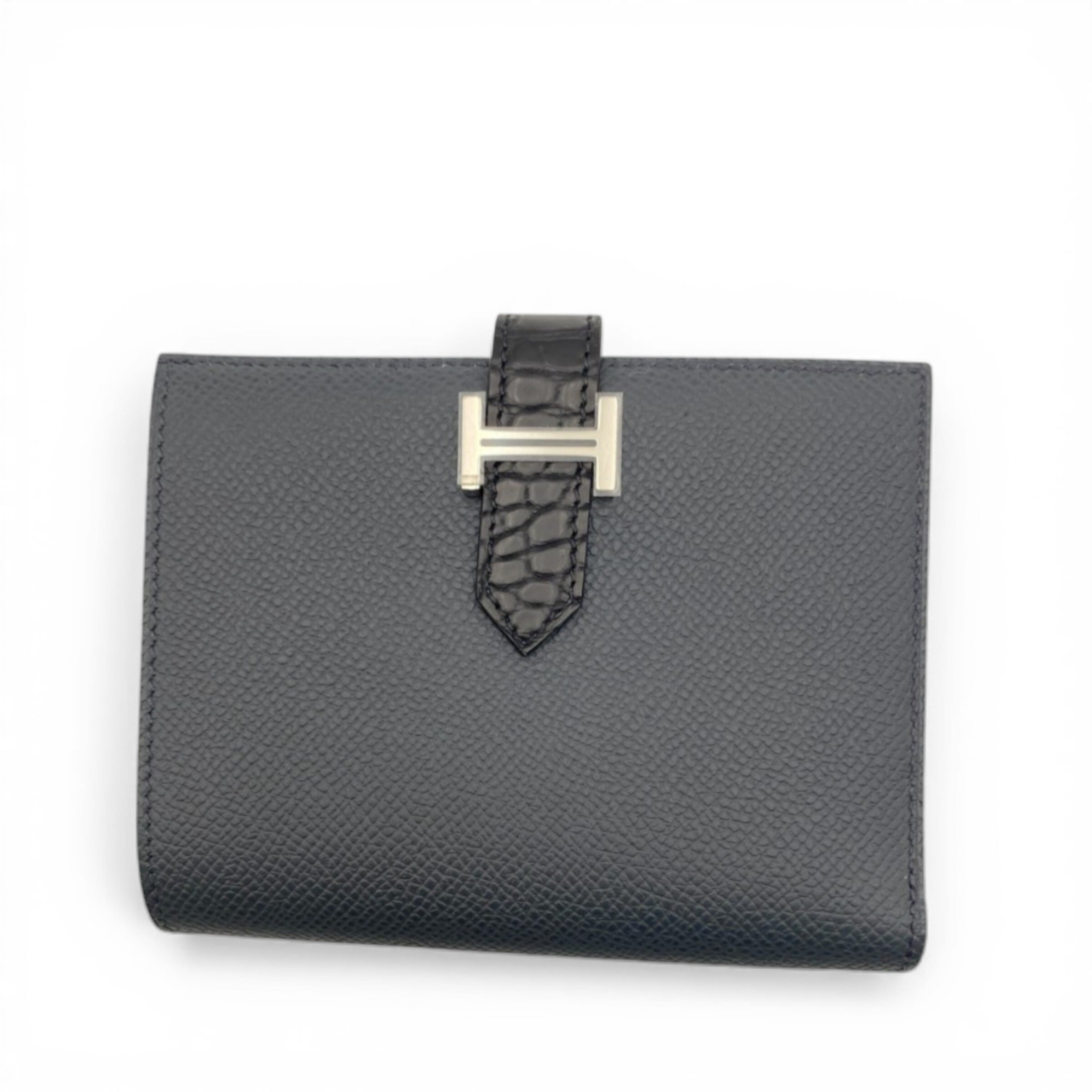 エルメスの「ベアンコンパクト タッチ」は、上品なグリミスティ(グレー)とブラックのカラーコンビネーションが魅力の二つ折り財布で、耐久性のあるエプソンレザーと高級感あふれるクロコダイルアリゲーターマットを組み合わせ、シルバー金具のHバックルが洗練された印象を与えるエレガントなアイテムです。