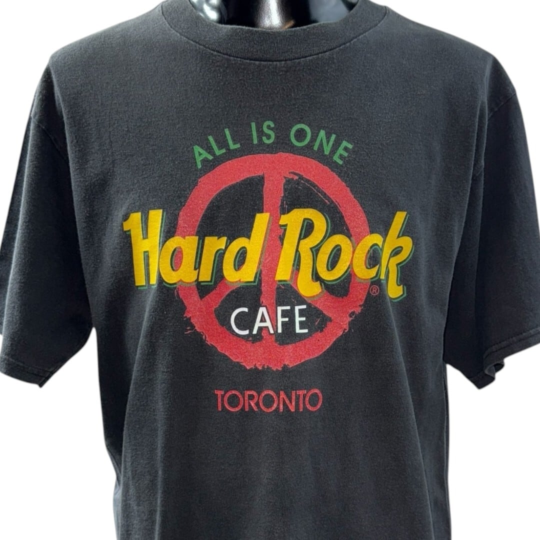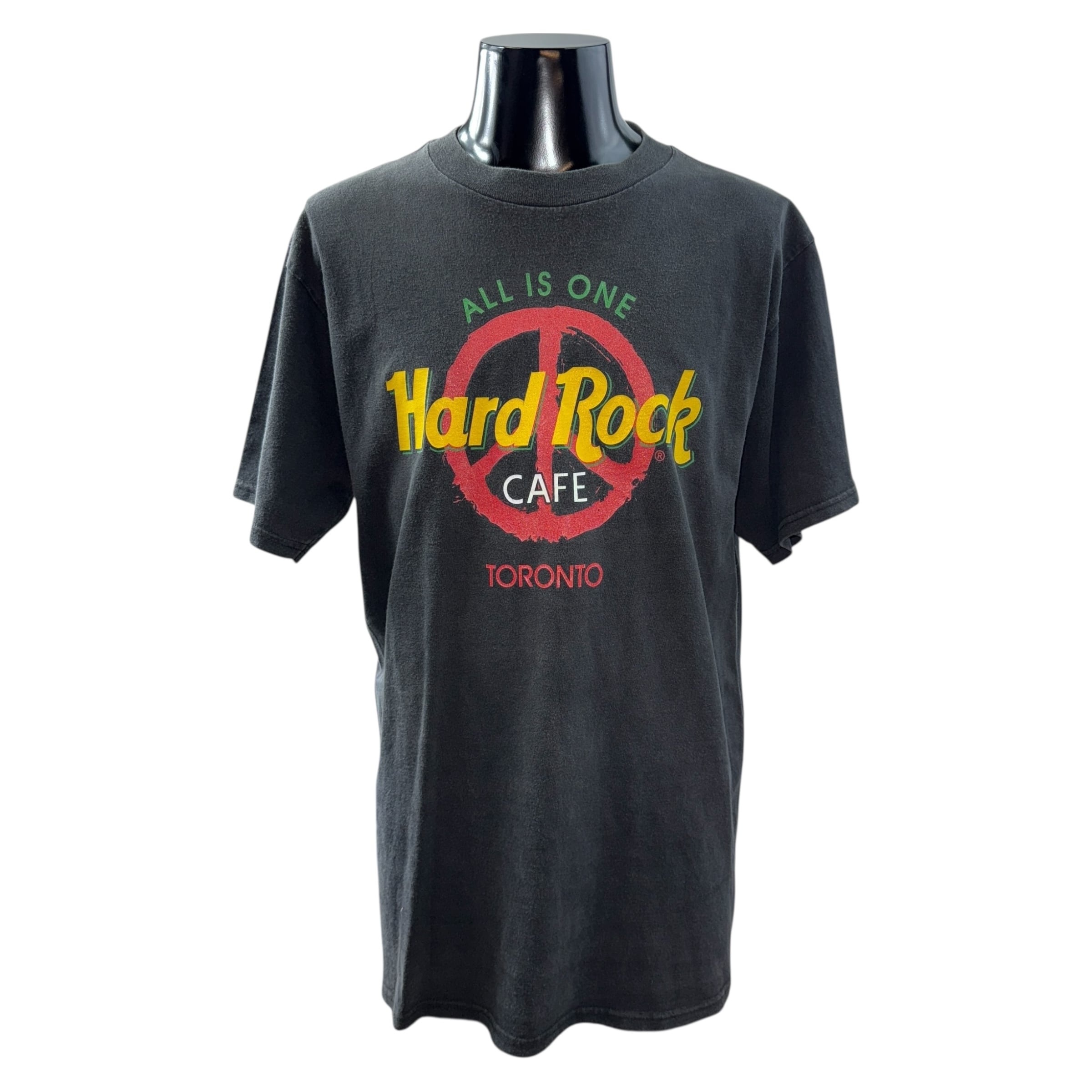フロントにグリーンでALL IS ONEのスローガン、レッドのピースマーク、イエローのHard Rockロゴ、下部に店舗名“TORONTO”を配したモデル。レゲエ配色(黄×緑×赤)がGOOD