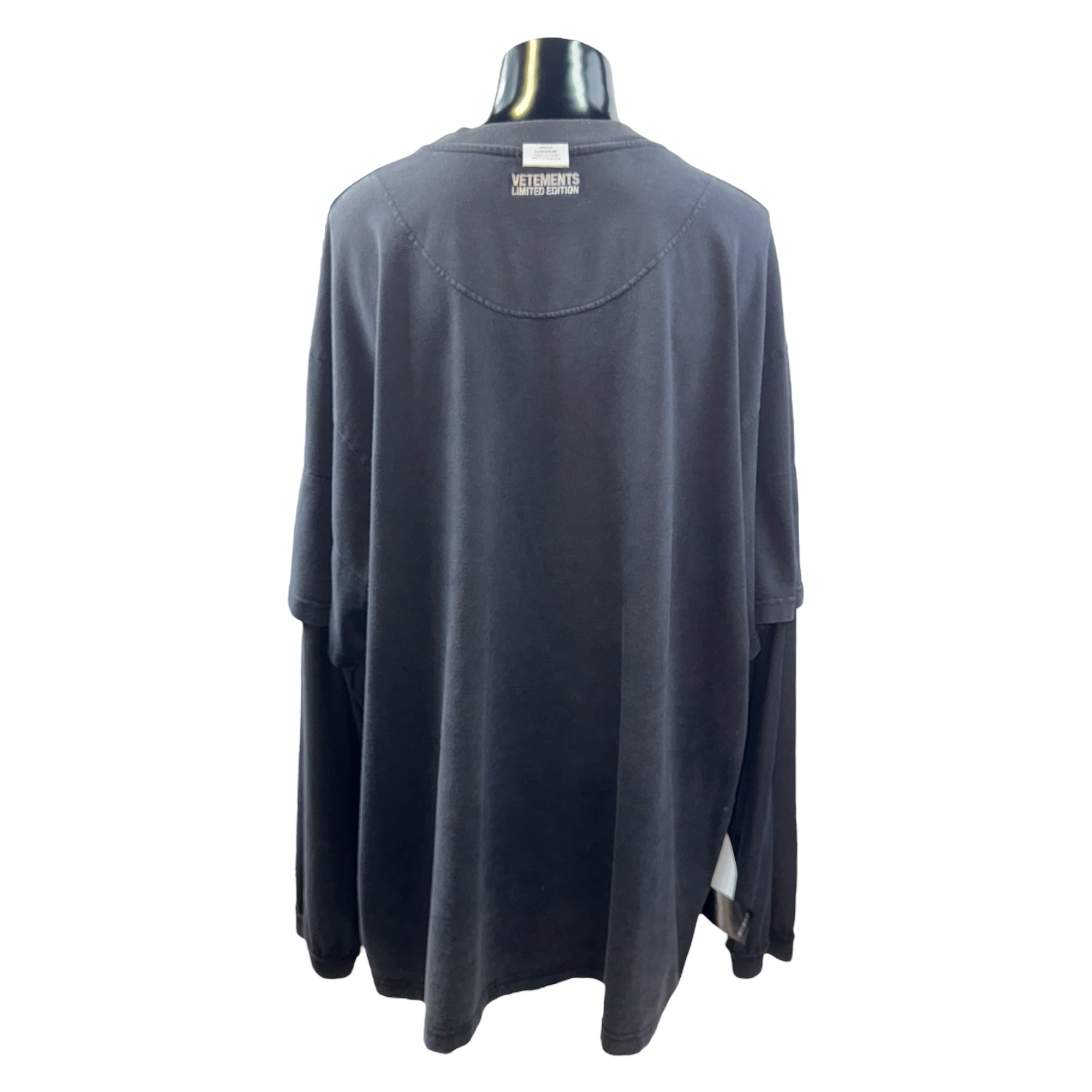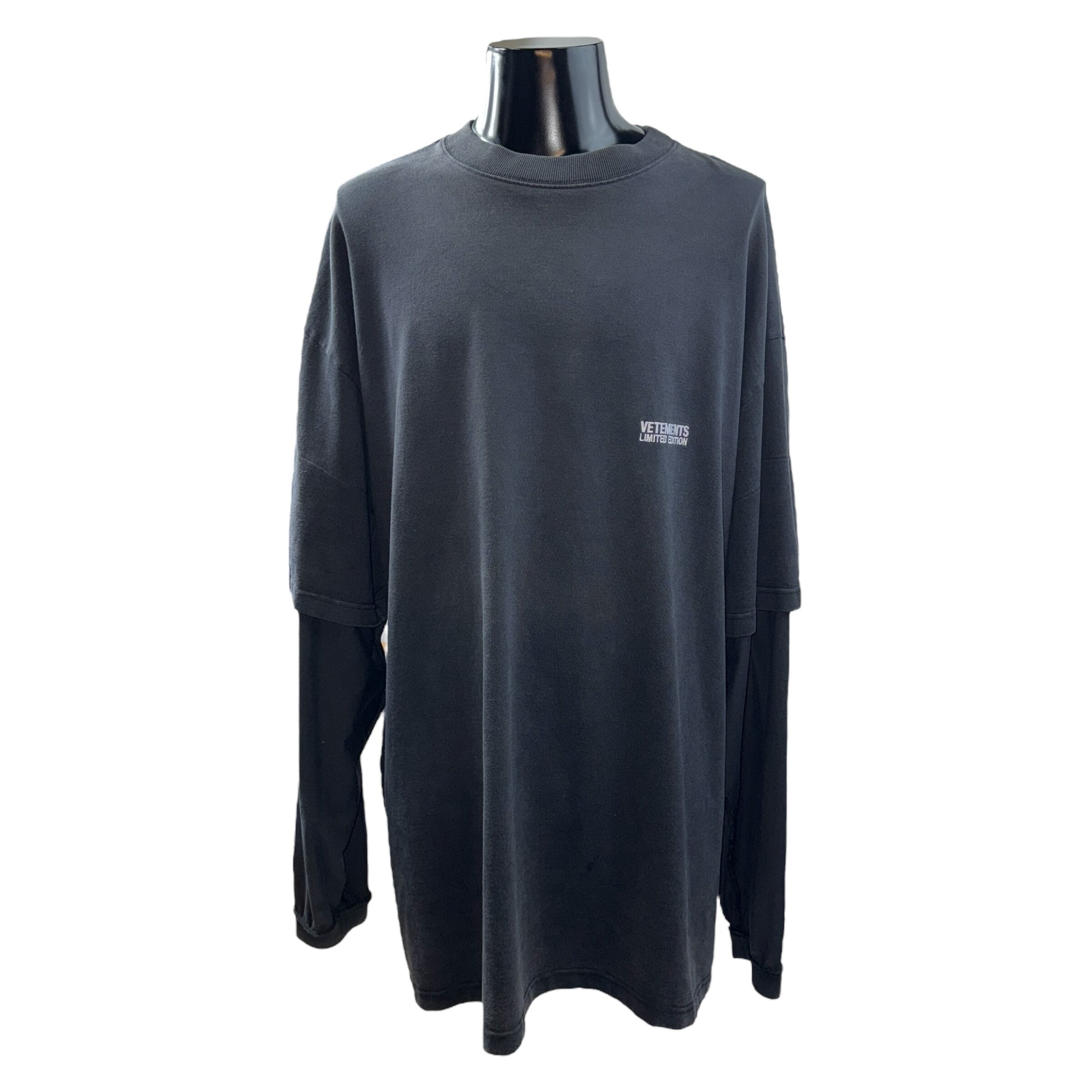 VETEMENTSのLIMITED EDITIONロングスリーブ。レイヤード仕様のデザインが特徴で、1枚で雰囲気のあるスタイルが仕上がります。ストリートとラグジュアリーを融合した同ブランドらしいバランスで、シンプルながら存在感のあるアイテムです。