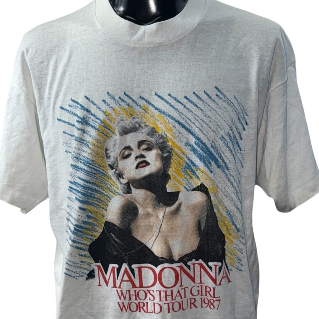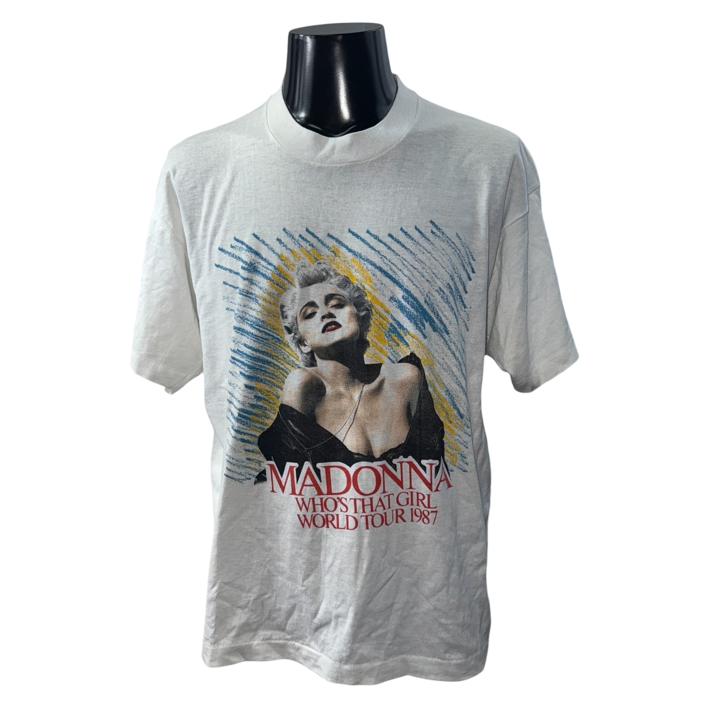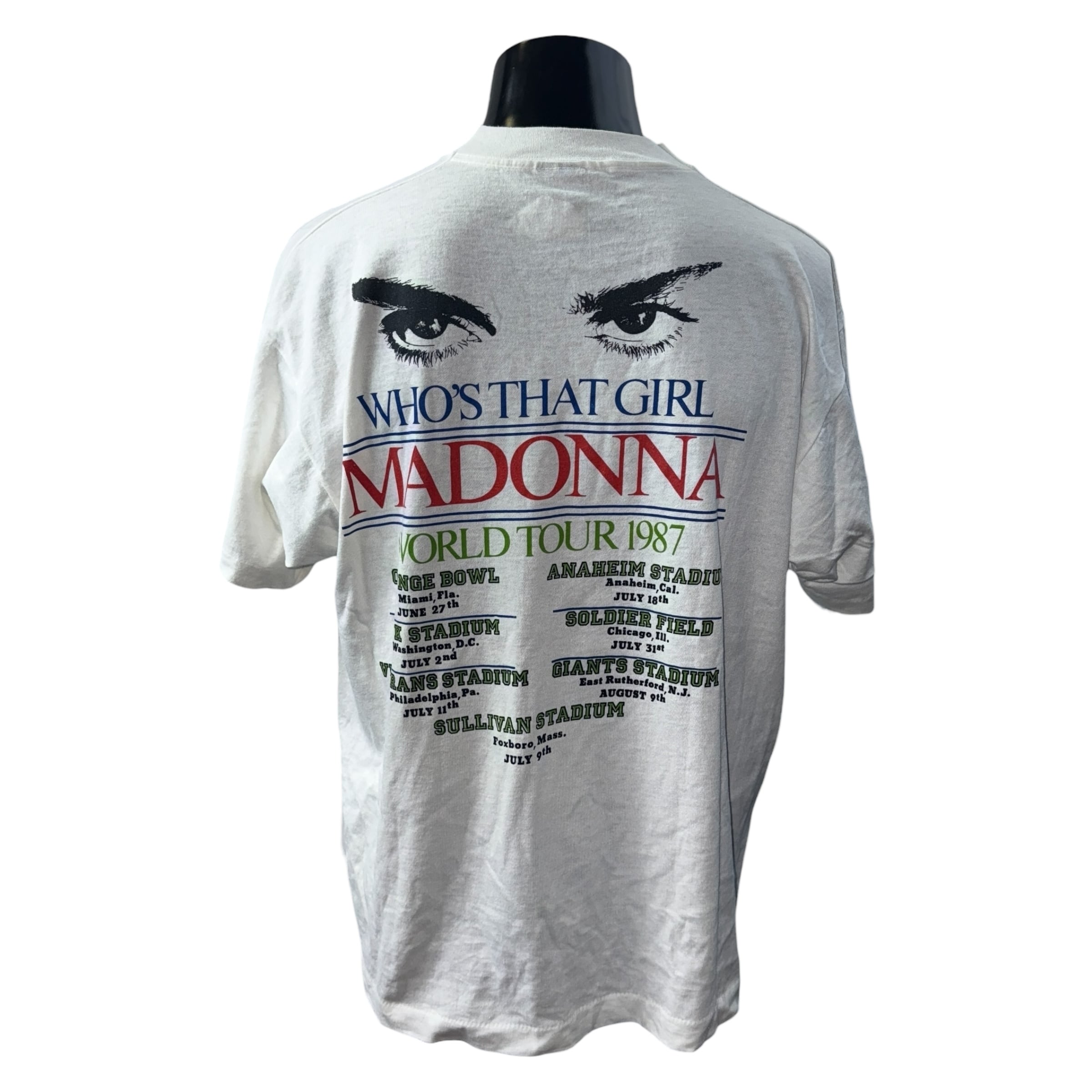 1987年のマドンナのワールドツアーを記念して販売された公式グッズで、ツアー日程が背面にプリントされているTシャツです。