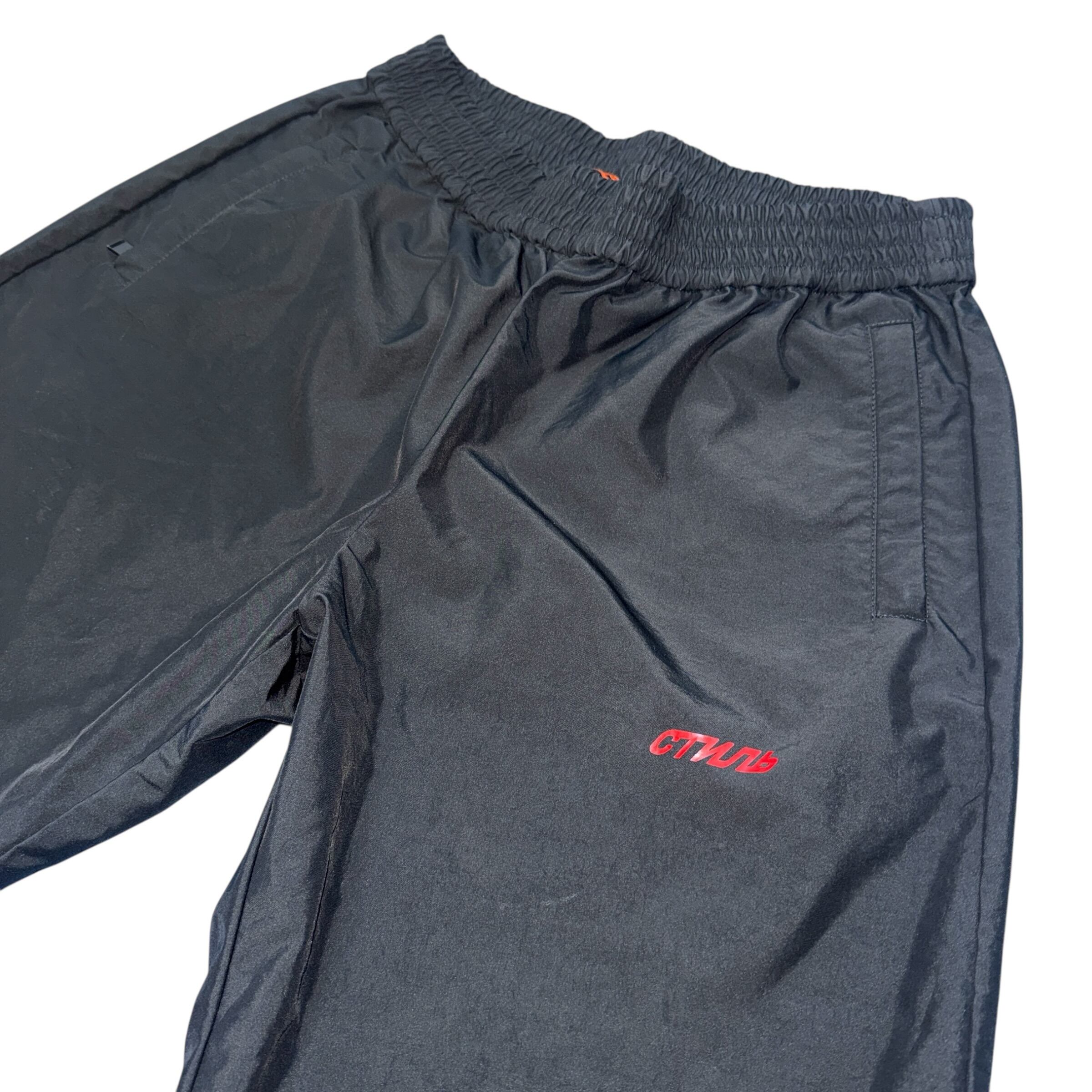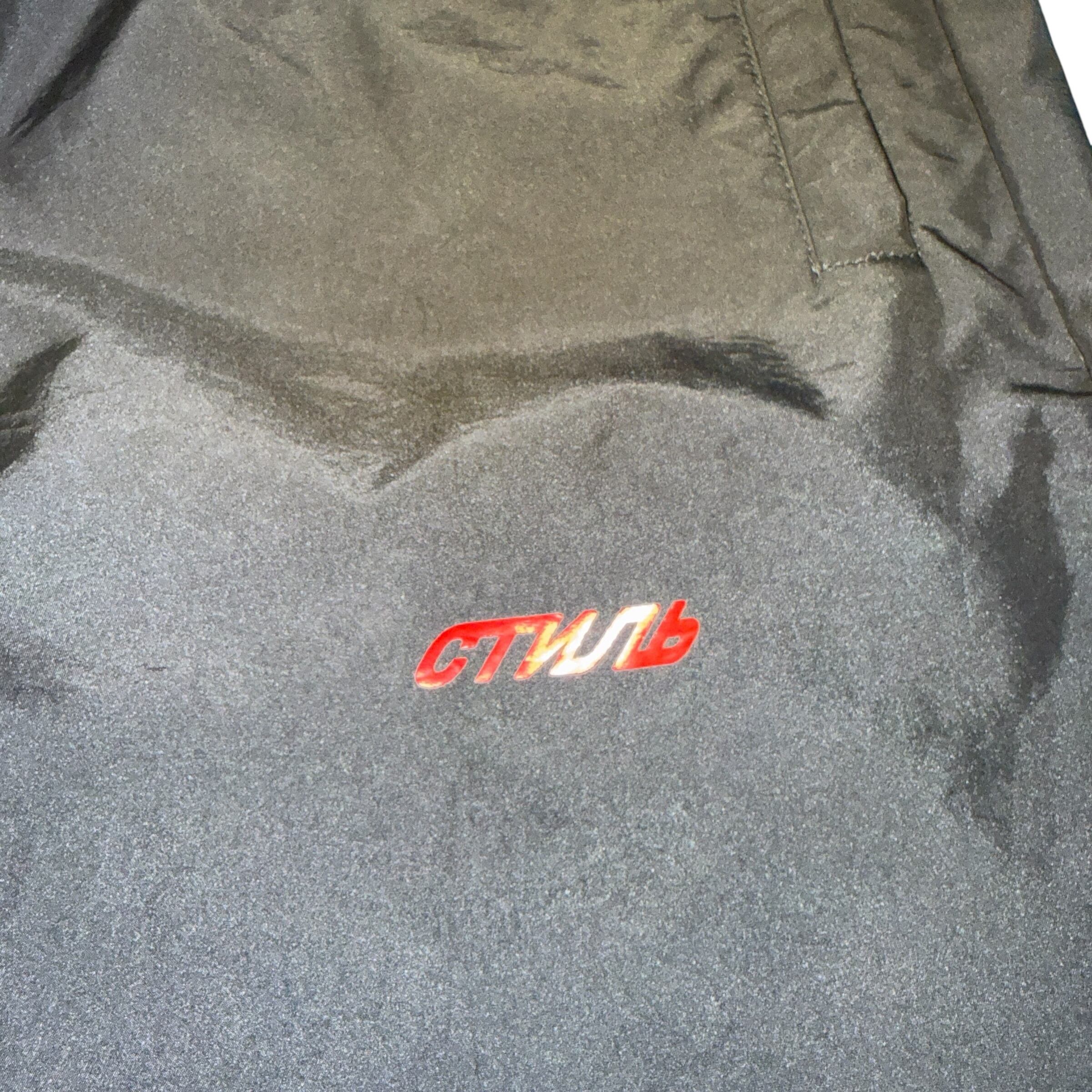 フロントに施されたロシア語の「СТИЛЬ(STYLE)」ロゴ刺繍が目を引くナイロン・トラックパンツです。