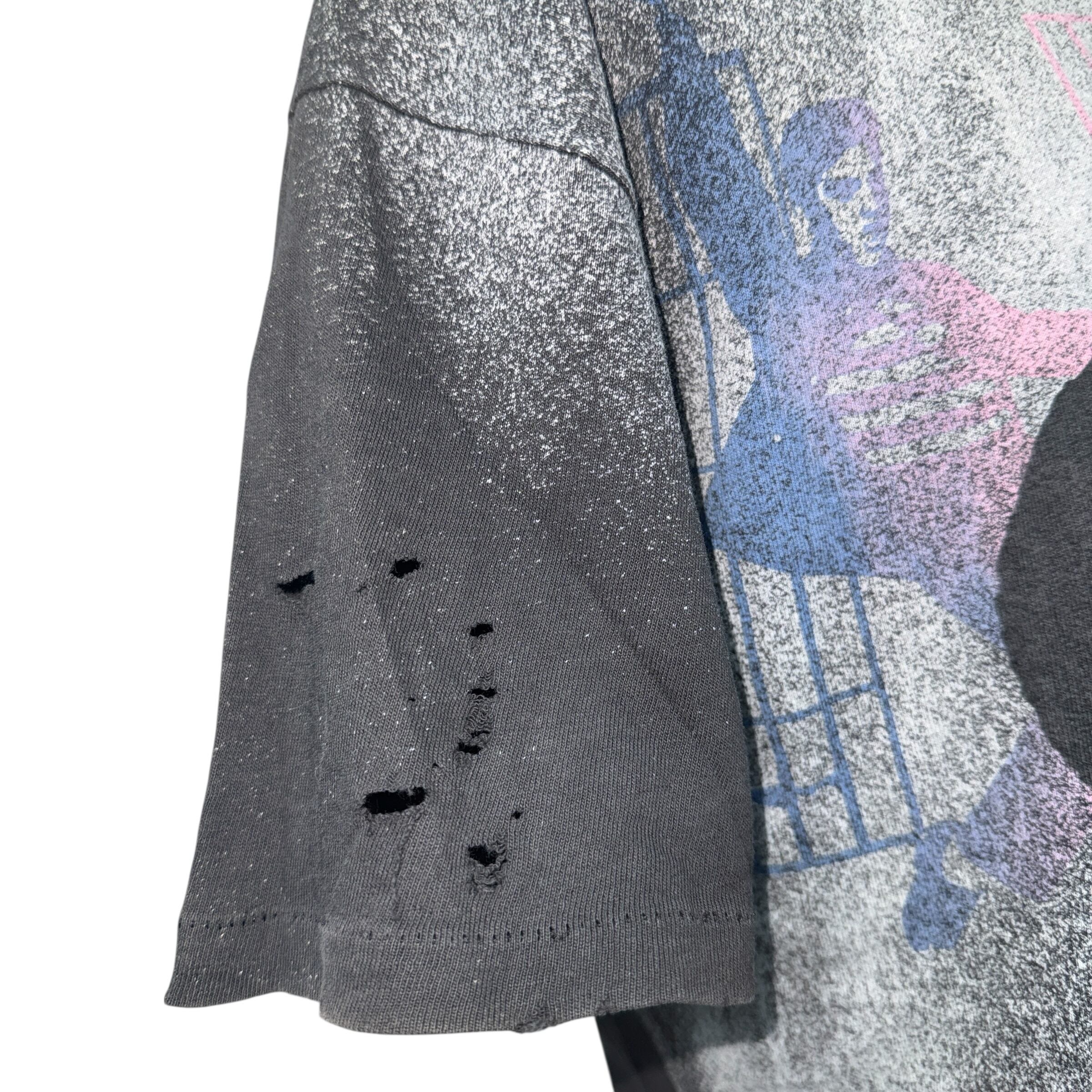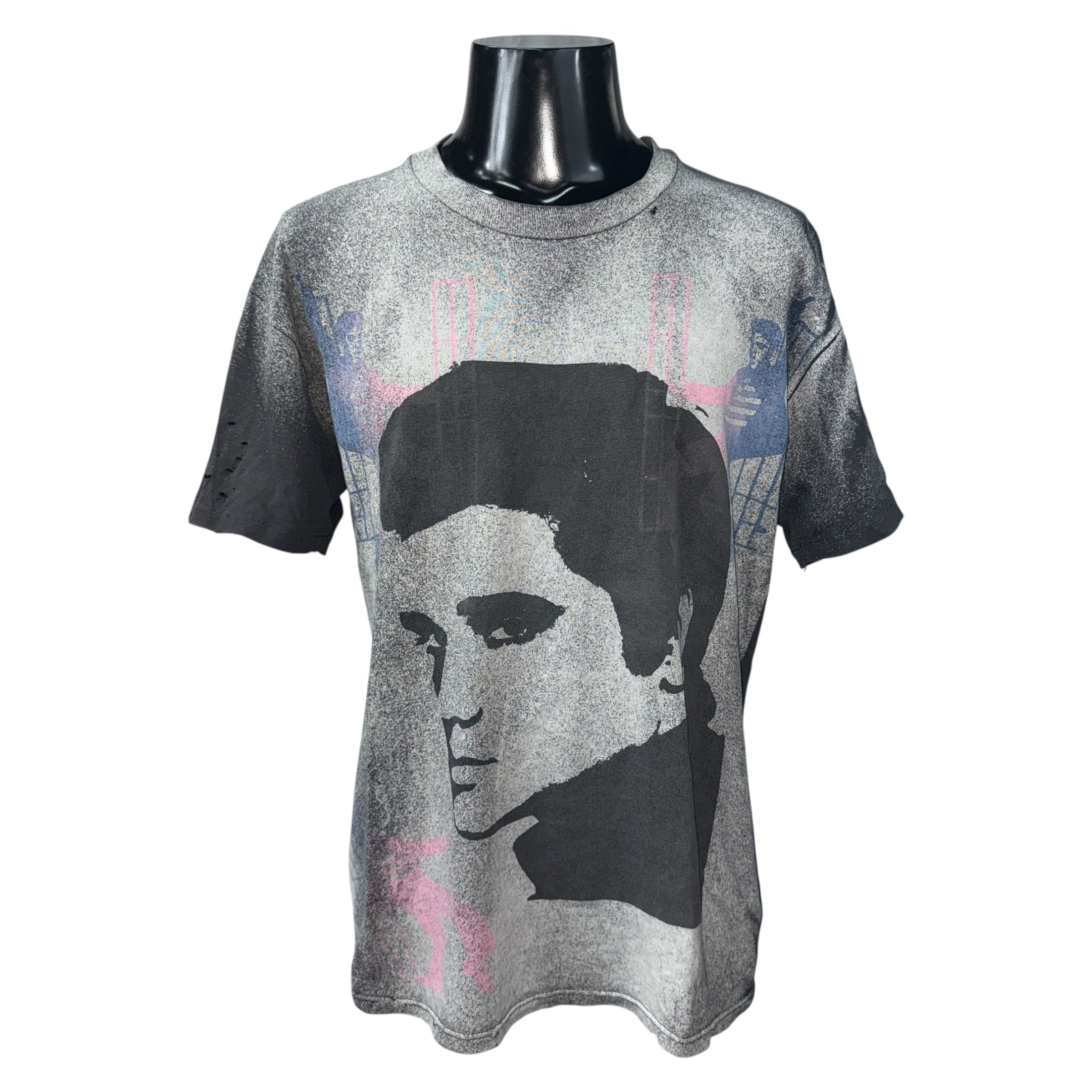 ロックスター、エルビス・プレスリーのポートレートを大胆なフルオーバープリントで表現した、90年代の希少なヴィンテージ。フロント全面を使ったアートワークにピンクやブルーのネオンカラーを挿した、当時のモダンな雰囲気が宿る一着です。