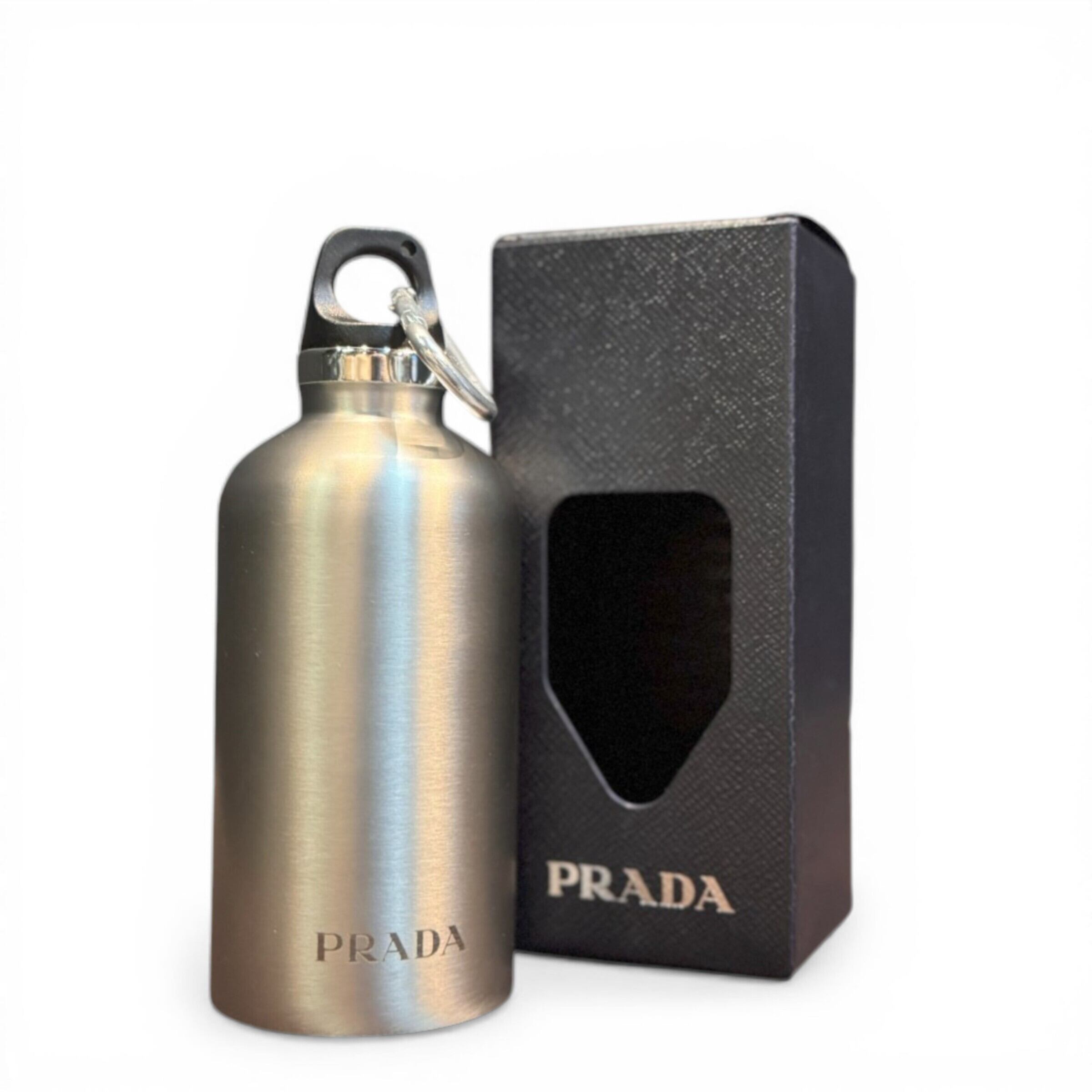 シルバーカラーに "PRADA" レタリングロゴ が際立つ、エレガントなデザインなのに